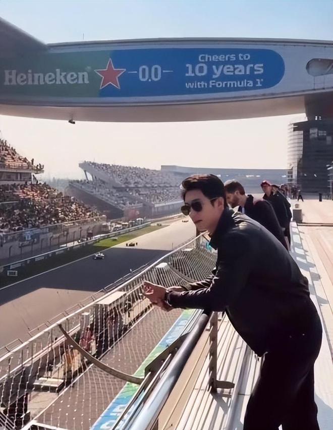 现场,黄景瑜以一身黑色皮夹克搭配墨镜的硬朗造型亮相,187cm的身高与宽肩窄腰的健硕身材在人群中极为醒目,被媒体形容为“画报级画面”。更引发热议的是,其整体形象与“林臻东”一角神似,观众纷纷直呼“是林臻东本尊来视察车队了”。这一巧合,将电影角色的“钞能力”与现实场景无缝链接,片中林臻东的经典台词“跟组委会买了plus”,被网友活用于调侃此次观赛体验:“他是不是真给F1组委会续了plus?”