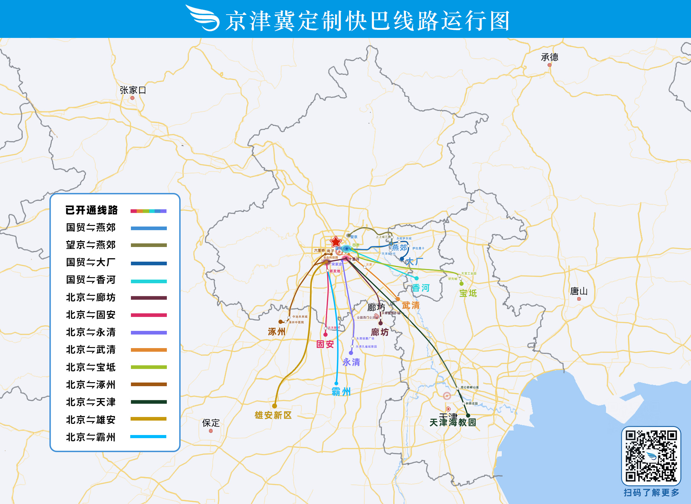 截至目前,京津冀定制快巴已开通北京地区至河北燕郊、大厂、香河、固安、永清、霸州、涿州、廊坊城区和天津武清、宝坻、海教园以及雄安新区等12条线路57条支线,共计开行16.3万余车次,客运量累计超530万人次,日发315班次,日客运量约9500余人次。